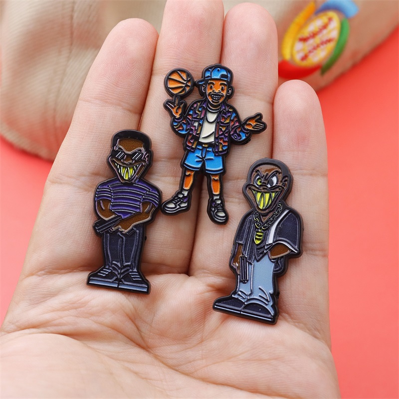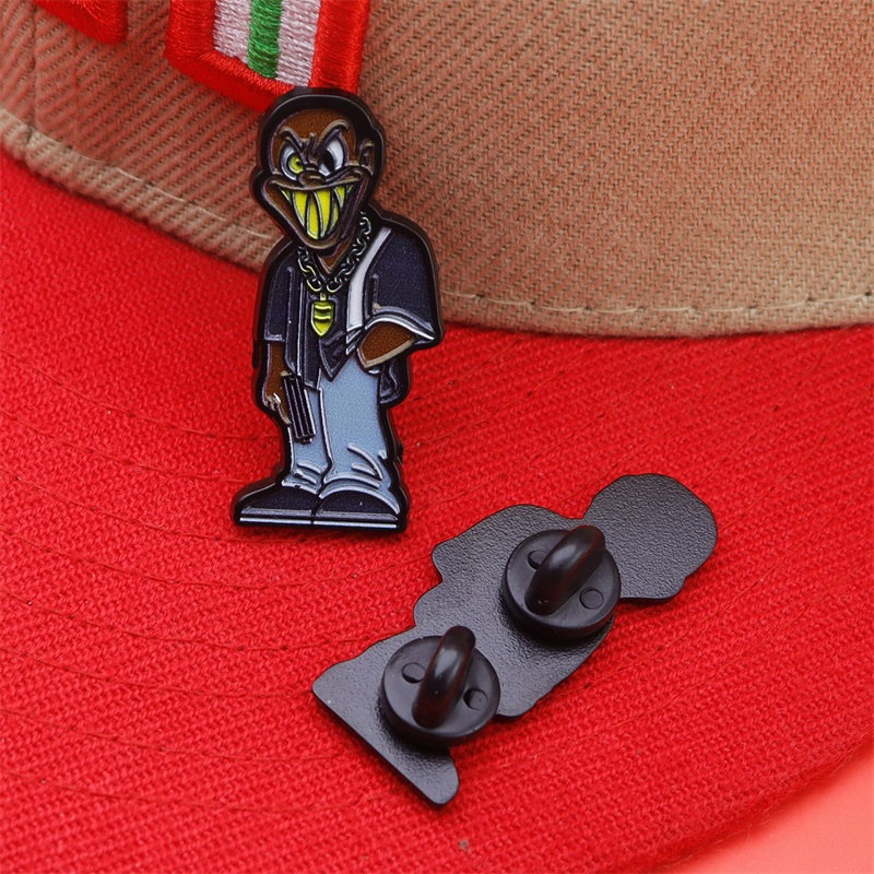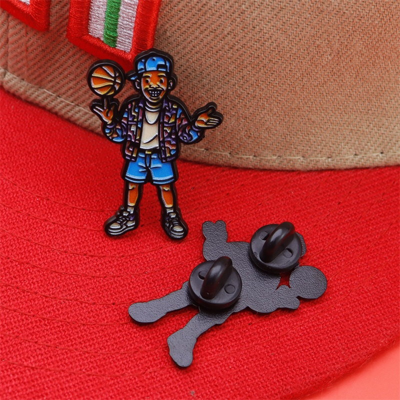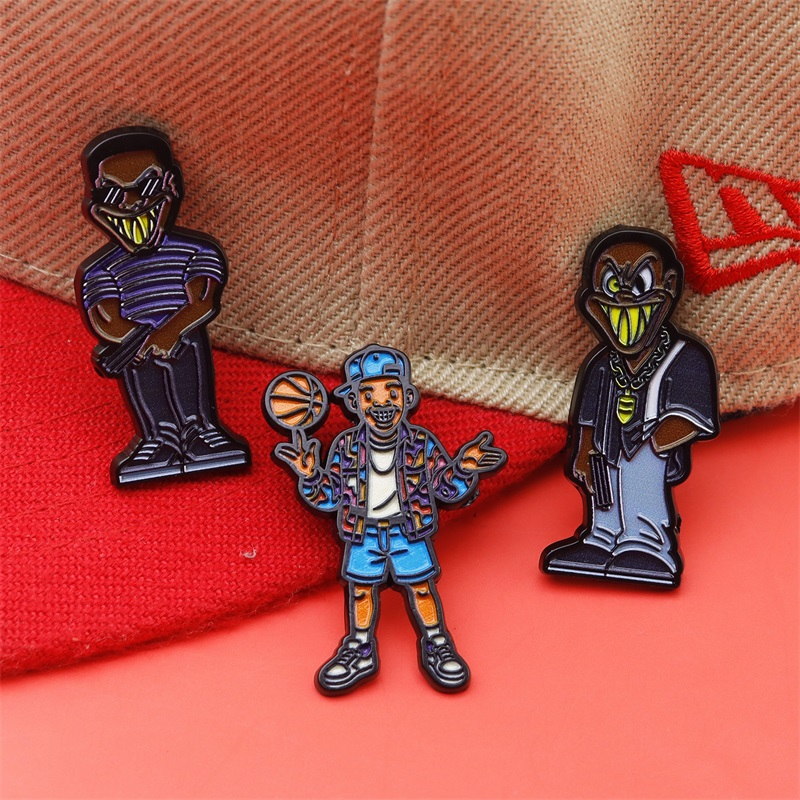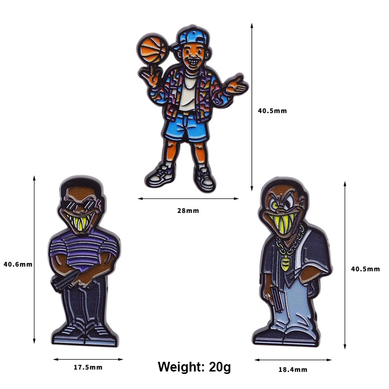 These pins sport 3D cartoon character silhouettes—distinct shapes (gun-toting, basketball-holding) with detailed attire and exaggerated teeth. Used to adorn caps or bags, they infuse urban street flair, adding bold, personalized visual appeal for street-style enthusiasts.