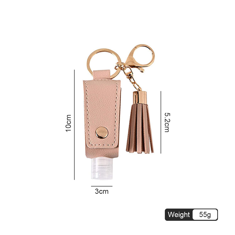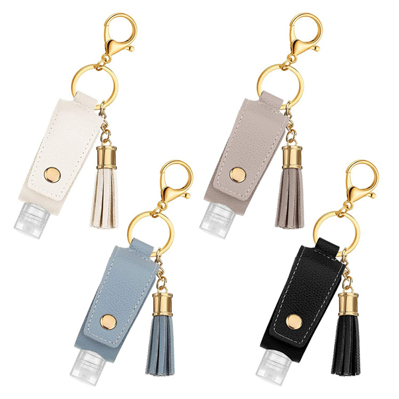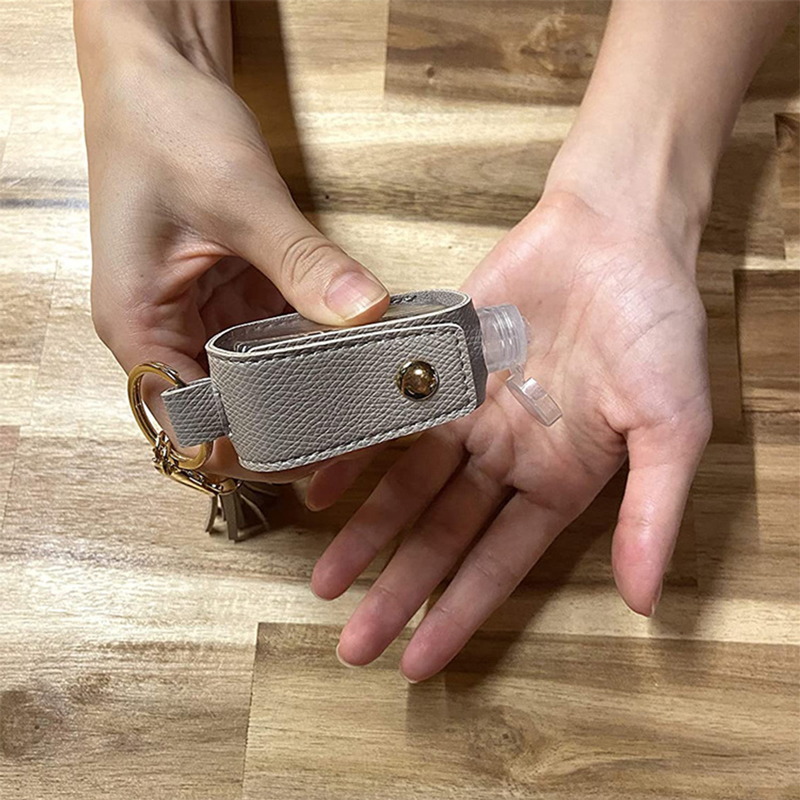 These keychains feature chic leather holders for hand sanitizer, adorned with gold accents and tassels. Their elegant design, in neutral and muted tones, blends functionality with fashion, appealing to style-conscious women seeking trendy, practical accessories.