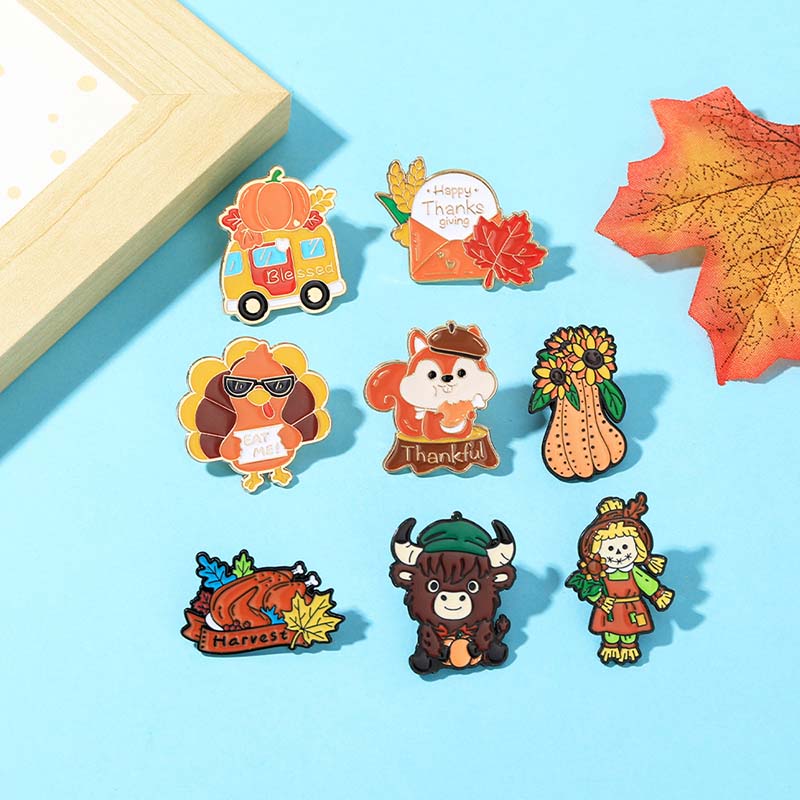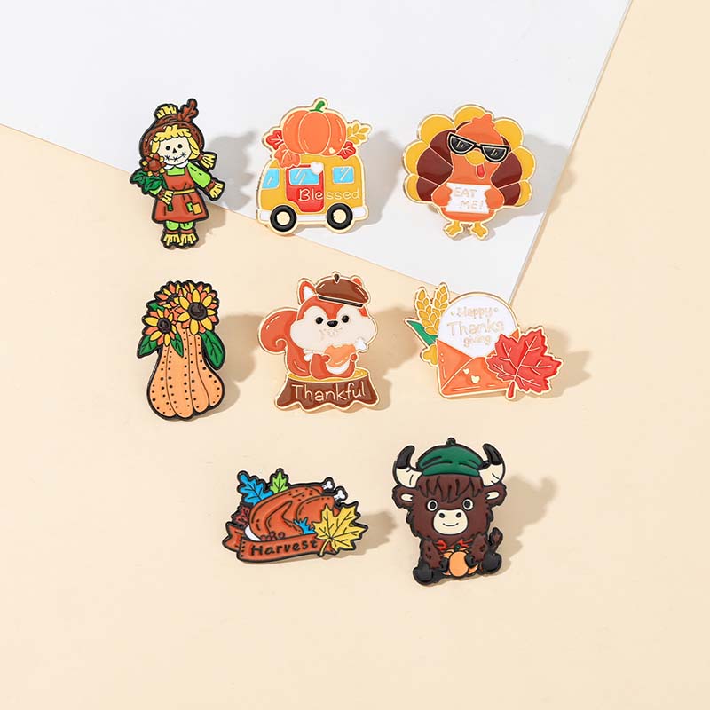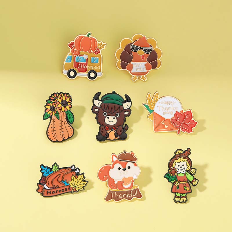 These 7 cozy Thanksgiving pins brim with harvest charm: a "Thankful" squirrel, "Harvest" turkey, "Blessed" pumpkin truck, plus a scarecrow and sunflowers—vibrant fall tones amplify their warm, festive vibe. Ideal for adding seasonal cheer to bags/jackets or displaying as holiday collectibles.