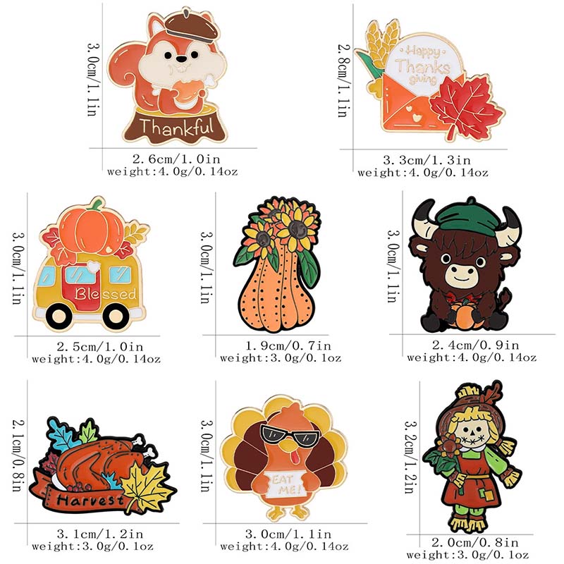 7 cozy pins (turkey, squirrel, scarecrow, pumpkin) — vibrant fall tones, "Thankful/Blessed" phrases. Perfect for adding harvest warmth to bags/jackets; ideal for Thanksgiving events or seasonal collectible decor.