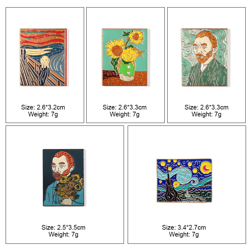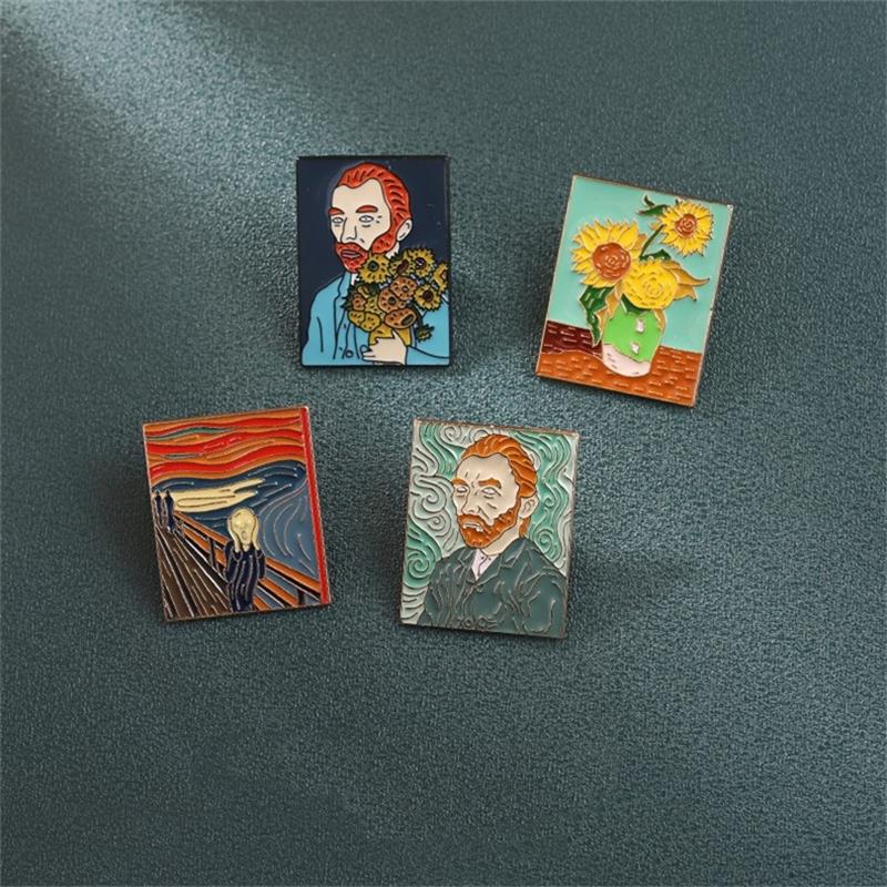 Features iconic works (Van Gogh self-portrait, Sunflowers, The Scream) in vivid enamel with crisp detailing. Ideal for art lovers to decorate bags, blazers, or hats—adds artistic, expressive flair to daily styles or art-themed outfits.