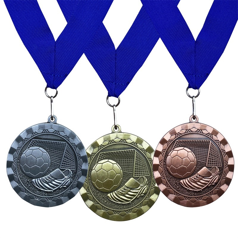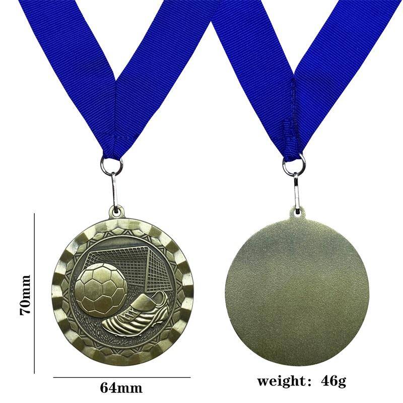 These circular soccer medals (antique gold/silver/copper zinc alloy) feature embossed football, cleat, and goal motifs. Designed for football tournaments, they honor players’ skill—blending sporty detail with durable craftsmanship to mark standout achievements in the game.